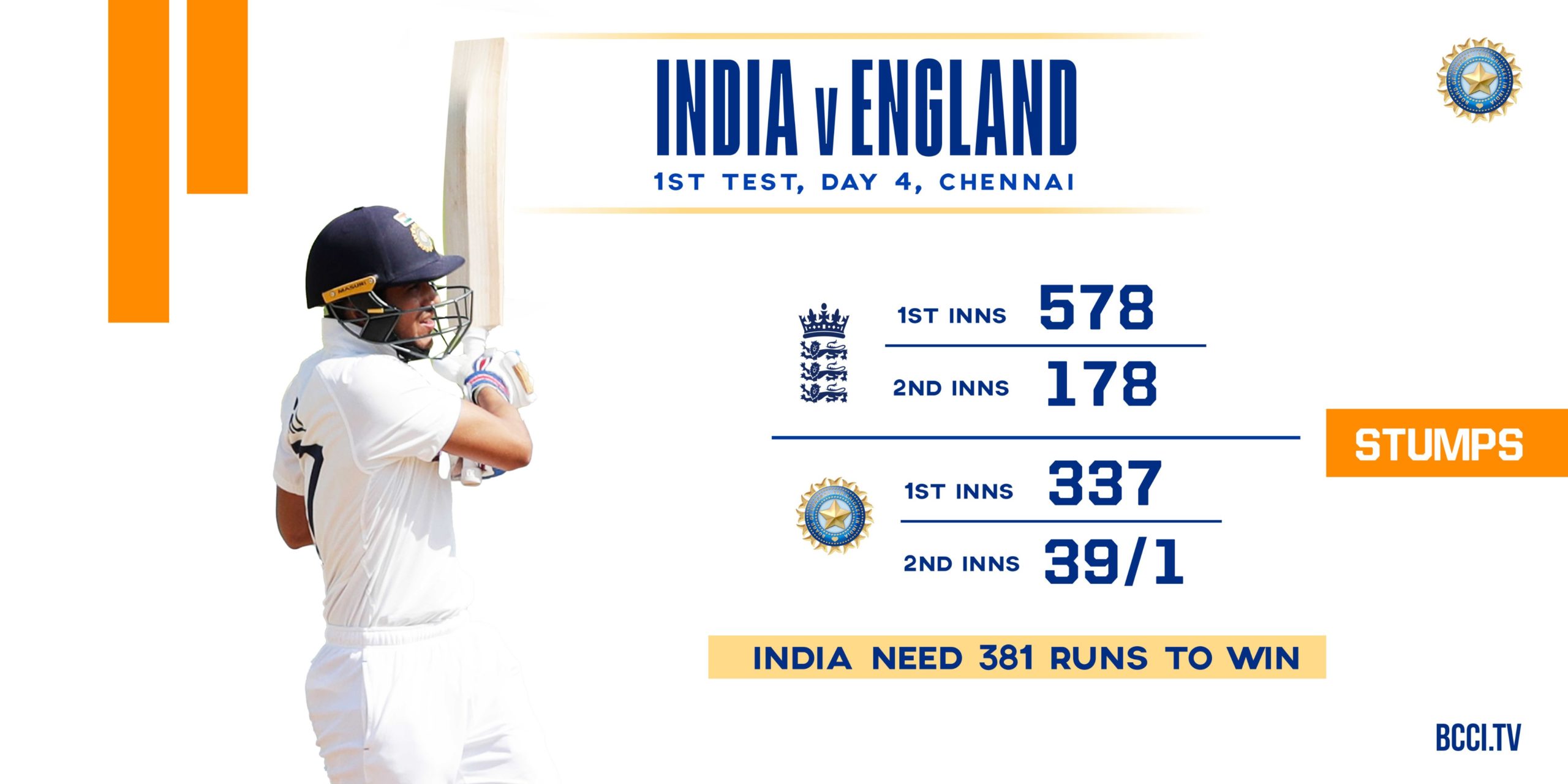पहिल्या डावातल्या २४१ धावांच्या आघाडीच्या जोरावर इंग्लंडने भारतासमोर विजयासाठी ४२० धावांचे आव्हान ठेवले आहे. आजच्या दिवसाचा खेळ संपला तेव्हा,भारताने रोहित शर्माच्या रूपात एक गडी गमावून तेरा षटकात ३९ धावा केल्या आहेत. सलामीवीर शुभमन गिल ३५ चेंडूत १५ तर चेतेश्वर पुजारा 23 चेंडूत 12 धावांवर खेळत आहेत. या कसोटी सामन्यात भारताला आपले आव्हान टिकवायचे असेल तर,उद्या शेवटच्या दिवशी शुभमन गिल आणि चेतेश्वर पुजारा या दोघांना पहिलं सत्र खेळून काढावं लागणार आहे.