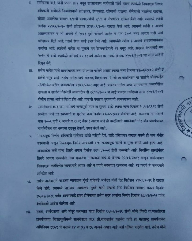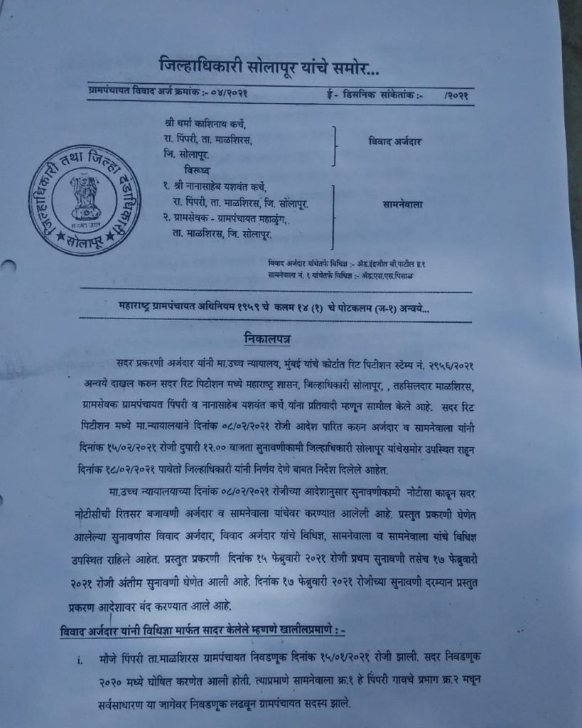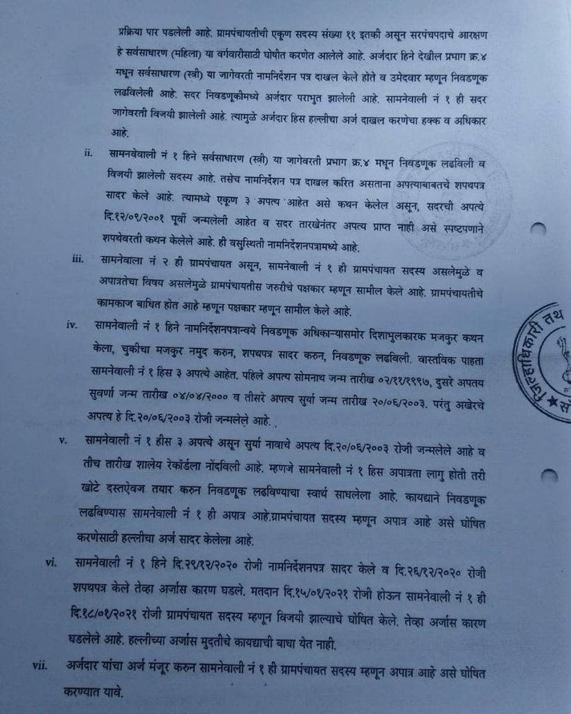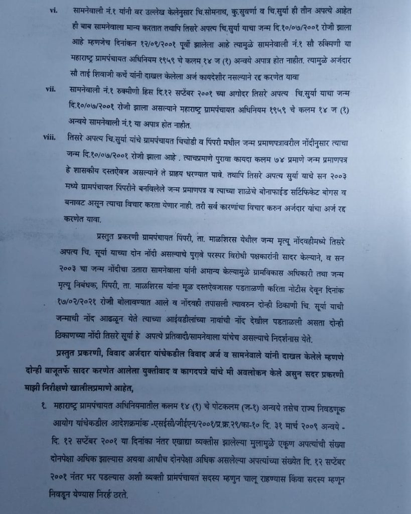 जिल्हाधिकाऱ्यांनी या प्रकरणाचा निकाल देताना म्हटले,दोन्हीं प्रतिवादींना 12 सप्टेंबर 2001 नंतर एक-एक अपत्य जन्मले असून प्रतिवादी यांची एकूण अपत्ये दोन पेक्षा अधिक होत असल्याचे स्पष्ट होत आहे. आणि म्हणून विवाद अर्ज मंजूर करण्यात येत असून,महाराष्ट्र ग्रामपंचायत अधिनियम कलम १४(१) चे पोटकलम (ज-१)अन्वये नाना यशवंत कर्चे आणि रुक्मिणी हनुमंत कर्चे या दोन्ही सदस्यांना या आदेशाच्या दिनांकापासून पिंपरी ग्रामपंचायतीचे सदस्य म्हणून चालू राहण्यास ‘निरर्ह’ ठरवण्यात येत असल्याचं जिल्हाधिकाऱ्यांनी म्हटलं आहे.
