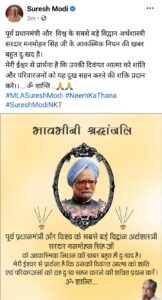 झारखंड सरकारचे पर्यटन आणि क्रीडा मंत्री ‘हाफिजुल हसन’ अन्सारी यांनीच फक्त जिवंतपणे श्रद्धांजली वाहिली असं नाही तर, काँग्रेसच्याही एका आमदाराने डॉ. मनमोहन सिंग यांना श्रद्धांजली वाहिल्याने सगळ्यांनाच आश्चर्याचा धक्का बसला आहे. राजस्थान मधील ‘निम का थाना’ मतदार संघाचे आमदार ‘सुरेश मोदी’ असं, या महाशयाचे नाव आहे. त्यांनी आपल्या अधिकृत ‘फेसबुक पेजवरून’ माजी पंतप्रधान मनमोहन सिंग यांना जिवंतपणे श्रद्धांजली वाहिली. मात्र ही चुकीची बातमी असल्याचे त्यांच्या लक्षात आल्यानंतर ही पोस्ट त्यांनी डिलीटही केली.